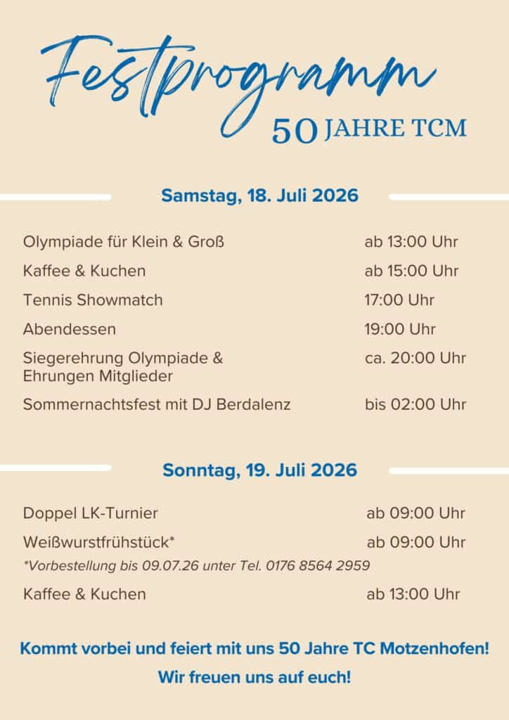 Am 18. und 19. Juli 2026 feiert der TC Motzenhofen sein 50-jähriges Vereinsjubiläum. Aus diesem Anlass findet ein abwechslungsreiches Festwochenende mit Sport, Unterhaltung und geselligem Beisammensein statt.