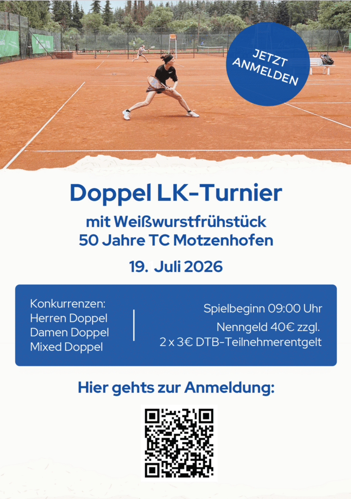 Unser TC Motzenhofen wird 50 Jahre! Dazu veranstalten wir am Sonntag, 19. Juli 2026 ab 9 Uhr ein LK-Doppelturnier mit Weißwurstfrühstück!