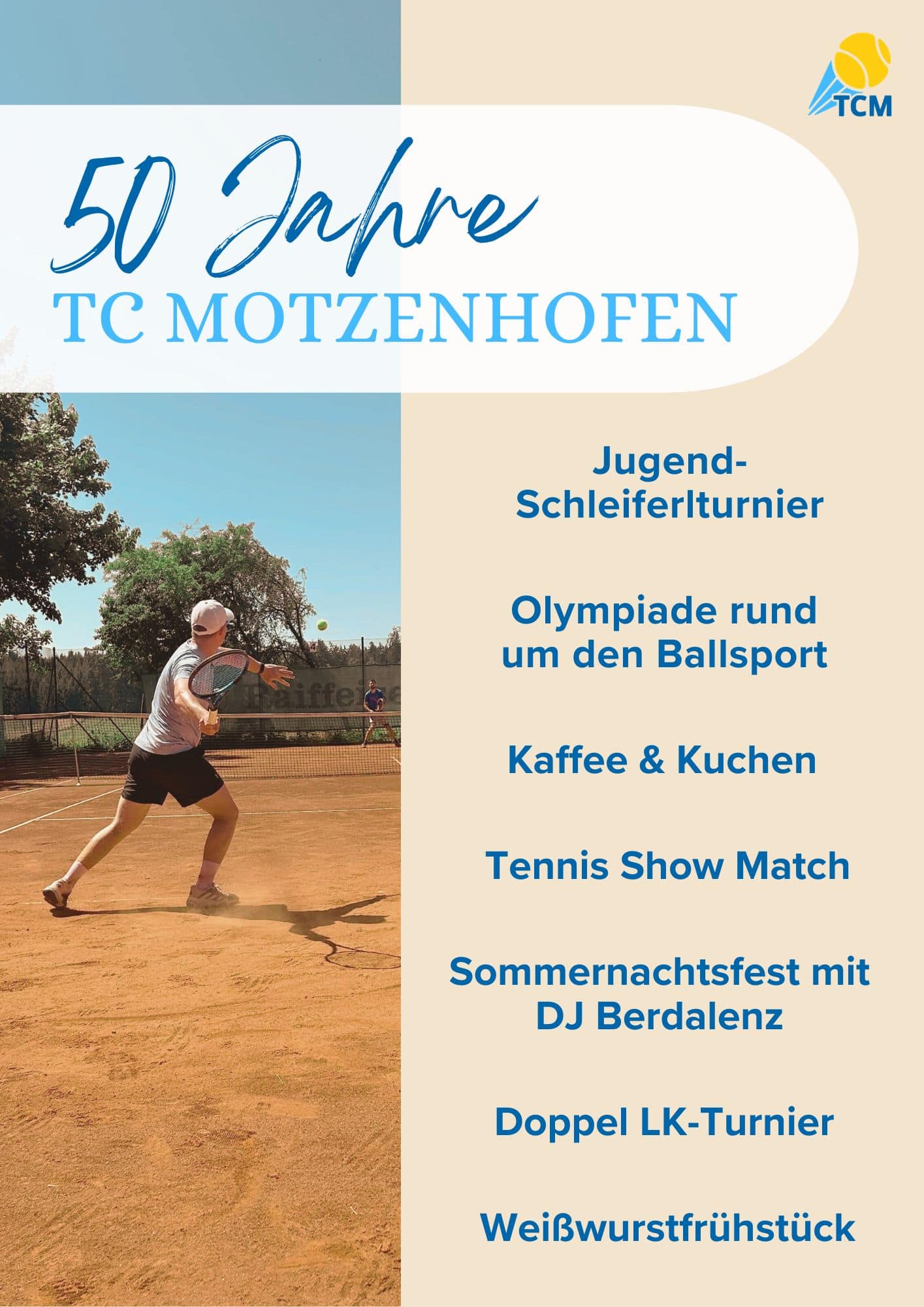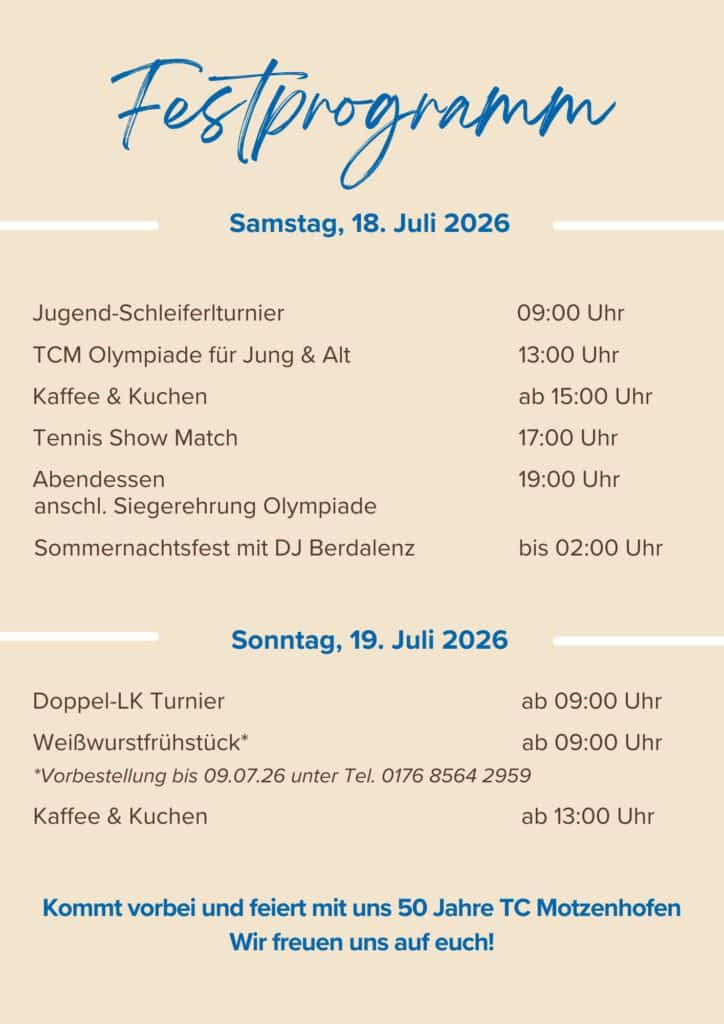 Am 18. und 19. Juli 2026 feiert der TC Motzenhofen sein 50-jähriges Vereinsjubiläum. Aus diesem Anlass findet ein abwechslungsreiches Festwochenende mit Sport, Unterhaltung und geselligem Beisammensein statt.