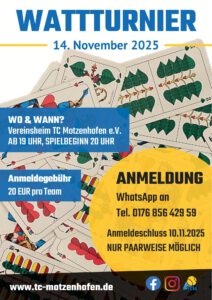 Termine AlleArbeitsdienstGeneralversammlungHeimspielSpielbetrieb Bambini Bambini II Damen Herren Herren 2 KnabenTurniereVeranstaltungen Termin Informationen: Fr.14Nov.2025 Watt-Turnier19:00 Uhr