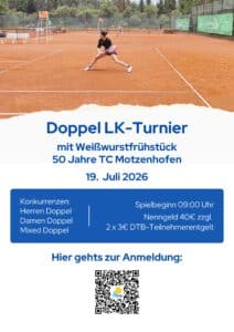 Termine AlleArbeitsdienstGeneralversammlungHeimspielSpielbetrieb Bambini Bambini II Damen Herren Herren 2 KnabenTurniereVeranstaltungen Termin Informationen: So.19Juli2026 Doppel LK-Turnier und Weißwurstfrühstück – 50 Jahre TC MotzenhofenBeginn: 09:00 UhrTC Motzenhofen e. V.